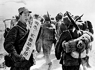 人民解放军战士严格遵守《三大纪律八项注意》。图为部队在行军途中宣传群众纪律(资料图片)。